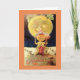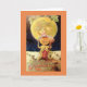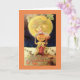 Retro / Vintage Halloween greeting card. Scarecrow with a Jack-o-Lantern head on a corn cob body stands in a field with a huge smiling moon! Charms of the Witching Hour! Hallowe'en!