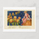 This postcard is a reproduction of a vintage Halloween postcard that features jack-o-lanterns in a line and a woman sitting on a pumpkin.