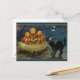 Halloween Pumpkins Jack-O-Lantern Black Cat - This antique illustration of a black cat and halloween pumpkins make a spooky Halloween gift. The image came from an antique Halloween postcard. This Scary Halloween card features three funny jack-o-lantern pumpkins. The carved pumkins are sitting on a big watermelon, out in a Halloween night with a black cat. There is a crescent moon in the background, setting the mood for a scary Halloween party. The black cat hisses as he sees the pumpkins.