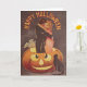 Retro / Vintage Halloween greeting card. Lovely couple enjoying a warm embrace and tender kiss while standing in a jack-o-lantern! A black cat and owl are sharing the love! Happy Halloween!