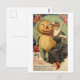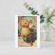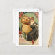 This postcard is a reproduction of a vintage Halloween postcard that features a woman and a jack-o-lantern.
