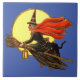 Square ceramic tile (6x6 inches) of a vintage witch on broomstick flying across the full moon.