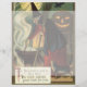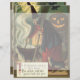 Vintage illustration Halloween holiday design featuring an evil wicked witch stirring her magic witch's brew in a black cauldron. A full moon, bats, a cat and a jack-o-lantern with a carved scary face make this Halloween picture complete!