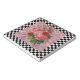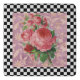 Pretty vintage pink roses botanical illustration on pink floral background with black and white checkerboard pattern border creates a lovely garden theme design.
