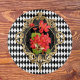 Pretty vintage red begonia botanical illustration with golden bee, on fancy scrolled black and gold frame surrounded with black and white Harlequin diamond pattern border create a lovely garden theme design.