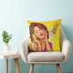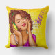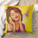 Throw pillow featuring a pop art illustration of a young pretty woman in vintage headphones listening music with closed eyes.