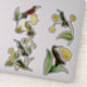 Set of four stickers with vintage illustrations of hummingbirds. Colorful green and red hummingbirds perched on tropical plants with yellow flowers.