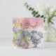 Beautiful, vintage, blue and pink mix, pastel, hydrangeas on left, mix with pink watercolor background. Pink pearls with pink butterfly on top give this a luxury elegance style. Black and white, antique hydrangea stamp on right.