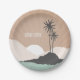 Plates featuring an illustration of two palm trees on an island with clouds and sunset at horizon. Look for matching wedding invitations and more at Jill's Paperie.