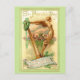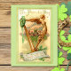 Antique St. Patrick's Day greeting card art featuring gold Irish harp, wreath with green ribbon, greeting, rustic background and scroll with verse in gold script.