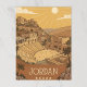 This postcard displays a vintage-style illustration of an ancient city scene in Jordan, possibly Petra or Amman, given the Roman-style amphitheater and cliff dwellings. The desert landscape is bathed in the warm glow of a rising or setting sun. Palm trees frame the foreground, and the word "JORDAN" is written vertically on the left side, accompanied by five stars.