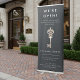 Announce your business reopening to the community with this vertical retractable banner that's perfect for real estate brokerages, realtors, and property management companies. Modern design features white lettering on a soft black background adorned with a vintage style skeleton key illustration in faux gold foil. Personalize with four template text fields for your headline, body text, company name, and contact information.