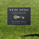 Announce your business reopening to the community with this lawn sign that's perfect for real estate brokerages, realtors, and property management companies. Modern design features white lettering on a soft black background adorned with a vintage style skeleton key illustration in faux gold foil. Personalize with four template text fields for your headline, body text, company name, and additional info.