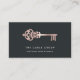 Elegant business cards for real estate agents or realtors feature a vintage skeleton key illustration in faux rose gold foil with your name or business name beneath. Add your full contact details to the reverse side in soft off-black on a white background, along with a photo.