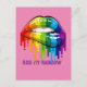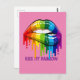 Rainbow lips on a postcard with a pink background. Lips are overlaid with the colours of the LGBT community pride flag in a graffiti style. At the bottom is a slogan in purple that says "Kiss My Rainbow"