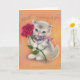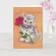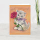 A vintage greeting card image features a cute gray and white kitten wearing a lavender ribbon tied in a bow. She sits on her haunches and holds a single stem red rose as if she's offering it to you. The front of the card say, "Hello! Thinking of You." The message inside the card is, "Hope everything is going well in your little corner of the world."