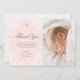 An elegant baptism thank you card featuring vintage lace details on a pastel background with baby photo and personal message. The back is intentionally left blank to allow for additional photos or lengthier message if desired.