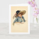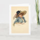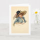 A vintage illustration of a lovely lady sitting at a table with pen in hand and note paper in front of her. She seems lost in thought as she decides on the perfect wording for the letter or note she's writing. She wears a light blue dress and a large wide-brimmed hat adorned with feathers. This card is blank inside for your own message.