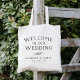 Simple and chic wedding welcome tote bags feature "welcome to our wedding" in black vintage style block typography with a decorative flourish and your names and wedding date beneath.