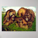 A vintage painting of a family of lions and lion cubs reclining together