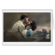 A vintage colorized photograph of a man and woman in love, embracing and kissing against a dusky grey landscape background. Night falls and lovers unite. The card is blank inside for your handwritten message.