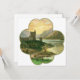 Vintage illustration Victorian Saint Patrick's Day Greetings holiday image. An Irish landscape with a castle next to a river at sunset inside a large golden lucky shamrock. Four Leaf clovers represent good luck!