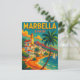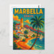 Step back in time to sun-drenched days and starlit nights on the southern coast and the Costa del Sol of Spain. Nestled between the golden sands of the Mediterranean and the Sierra Blanca mountains, Marbella dazzles with old-world charm and timeless elegance. Whitewashed buildings line cobblestone streets, bougainvillea drapes over balconies, and vintage convertibles cruise the palm-lined promenade. Customize this vintage travel postcard now.