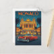 Step into the world of luxury with this stunning vintage-style postcard of Monaco. The illustration captures the essence of the French Riviera at night, featuring the world-famous Monte-Carlo Casino illuminated in gold. A sleek, classic red convertible in the foreground adds a touch of retro glamour and sophistication.