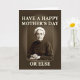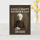 This card features a sepia portrait of an elderly woman centered inside a softly darkened rectangular frame, giving it an old-photo look with a sharp, steady gaze. She wears a pleated white cap around her face and a dark, high-collared outfit fastened with a neat row of small buttons. Her hands rest clasped near the bottom edge of the frame, a restrained pose that feels like a firm warning delivered with a hint of affectionate family humor ❤️. The background stays in rich browns and warm cream tones, keeping the mood antique and serious while still inviting a knowing smile. Across the top, large cream-colored text reads “HAVE A HAPPY MOTHER’S DAY,” set in thick lettering with a slightly raised look against the darker backdrop. Near the bottom, the smaller line “OR ELSE” appears in the same cream tone, spaced below the portrait like a dry punchline 🌼. The cream letters have gently softened edges, and the vignette shading deepens toward the corners around the frame.