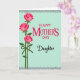 This greeting card features three stylized pink roses along the left side, their layered petals shifting from light blush to deeper fuchsia, like a gentle bouquet offered with care ❤️. Slender green stems with dark green leaves are gathered together by a green ribbon tied into a neat bow, adding a sweet, thoughtful touch. The background is a muted mint green, giving the flowers room to stand out while keeping the scene calm and soft. On the right, the main message “HAPPY MOTHER’S DAY” sits prominently in fuchsia lettering that echoes the darkest rose tones. Below it, the word “Daughter” appears in flowing black cursive, tucked underneath like a quiet signature from someone close 🌼. Delicate lace-like scroll borders in light gray run along the top and bottom edges, adding a vintage, decorative finish. The right-side text is balanced against the left-side bouquet so the layout feels like a tender exchange. The roses are arranged in a vertical cluster on the left, while the fuchsia headline and black “Daughter” sit centered on the right within the pale mint field and gray scrollwork.