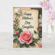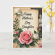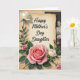 Designed with an antique, parchment-like scroll at the center, this card presents the message “Happy Mother’s Day Daughter” in flowing dark lettering. The text sits prominently across the middle of the scroll, with curled edges that add a gentle, timeworn touch. Surrounding it is a lush border of pink roses, small rosebuds, and deep green leaves, arranged as if lovingly placed around a keepsake ❤️. A fully open pink rose anchors the lower left area, its layered petals shaded from soft blush to deeper pink. Nearby, a few creamy white roses and scattered bright buds weave through the greenery, suggesting a tender closeness like a warm embrace 🌼. On the right side, a partially shown black-and-white portrait features a young woman with a calm face and softly clasped hands, as though she’s holding a quiet, affectionate thought. Behind everything, faint faded writing and soft, diffused light give the scene a gentle glow across the flowers and the scroll.