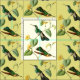 Two bright green hummingbirds with black and white face masks perch on a tropical vine with bright yellow flowers. Shown on a light yellow background; select "Customize it" to change background color.