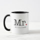 This classic Mr mug features bold vintage typewriter-style typography with a red heart accent and a custom last name in clean spaced lettering, all on a crisp white background with a striking black handle and interior. The timeless design combines strong typography with romantic detail for a mug he will reach for every morning. The last name is fully editable for a personalized keepsake. A great gift for the groom, newlywed husband, or anniversary. Pair with the matching Mrs design for a his and hers set.