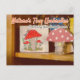 Add a touch of whimsy to your correspondence with this charming vintage-inspired postcard featuring handcrafted mushroom decorations nestled on a rustic wooden shelf – perfect for nature lovers and collectors of quaint home decor.
