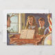 Vintage illustration musical design featuring a teacher playing the piano with classical sheet music and children, teaching lessons to her students who are singing in class.