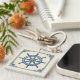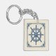 This nautical keychain features a vintage style captain's wheel in blue on off white with a fancy blue border. Image generated with AI.