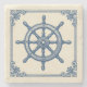 This nautical stone coaster features a vintage style captain's wheel in blue on off white with a fancy blue border. Image generated with AI.