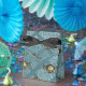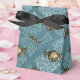 Favor box featuring a golden crab pattern against a distressed grunge damask background in accents of soft teal and aqua blue.