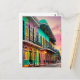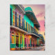 A vibrant and colorful illustration of a charming street in New Orleans, Louisiana, featuring rows of colorful Creole townhouses. The buildings are painted in bright shades of pink, yellow, green, and blue, with intricate wrought iron balconies and ornate detailing. The street is lined with lampposts and bustling with activity, with people walking along the sidewalk and enjoying the lively atmosphere.