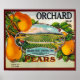 A beautiful vintage image of a poster advertising "Orchard" pears from Perham Fruit Corporation. This poster would look wonderful on any wall.