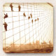 Antique photograph (public domain - pre 1925) : Painters posed on cables on Brooklyn bridge. Sepia and dark edge effects added