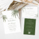The dark green elegant script font complements the lush palm imagery, adding a touch of sophistication and class to your invitation suite. The choice of color and font not only enhances the overall aesthetic but also ensures that your wedding details are presented clearly and beautifully.