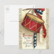 Vintage illustration patriotic Independence Day, Fourth of July holiday image featuring a drum surrounded by golden gold musical notes. You can almost hear the patriotism music playing in the marching band during the parade! "Three Cheers for the Red, White and Blue!" Ribbons with stars and stripes hold the drum sticks. By retro artist Ellen Clapsaddle.