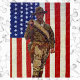 Vintage illustration patriotism design featuring a United States Soldier standing in front of the American Flag.