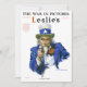 Vintage illustration patriotism military war magazine cover from Leslie's, December 29, 1917 by James Montgomery Flagg. This World War I cover art features the iconic Uncle Sam with a stern look pointing a gun at you and wearing a patriotic stars and stripes hat, the title is The War in Pictures and the tagline reads "Get off the throne."