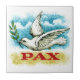 A vintage print dating from 1914 which reads simply ' Pax ', the Latin word for peace and depicts a dove with a sprig of green in her beak.