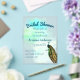 A vintage peacock by D'Orbigny brings elegance to this turquoise bridal shower invitation with watercolor splashed background and teal text.