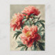 The vintage postcard features a captivating scene of lush peonies in full bloom, their vibrant hues capturing the essence of a bygone era. The delicate petals showcase a spectrum of pinks and whites, creating a harmonious blend that radiates timeless beauty. The background hints at a rustic garden setting, with hints of faded greens and subtle sepia tones, adding a nostalgic charm to the overall composition. The postcard's edges bear the gentle wear of time, a testament to its journey through the years.
