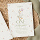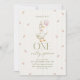 This "ONE Silly Goose" birthday invitation design features a cute goose with a balloon, and a whimsical vintage stripes background with cute pink flowers.