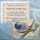 Vintage illustration travel and transportation design featuring a Douglas DC-7, four-engined, commercial, propellor aircraft. flying around the world. Fluffy white clouds in the sky high above the earth.